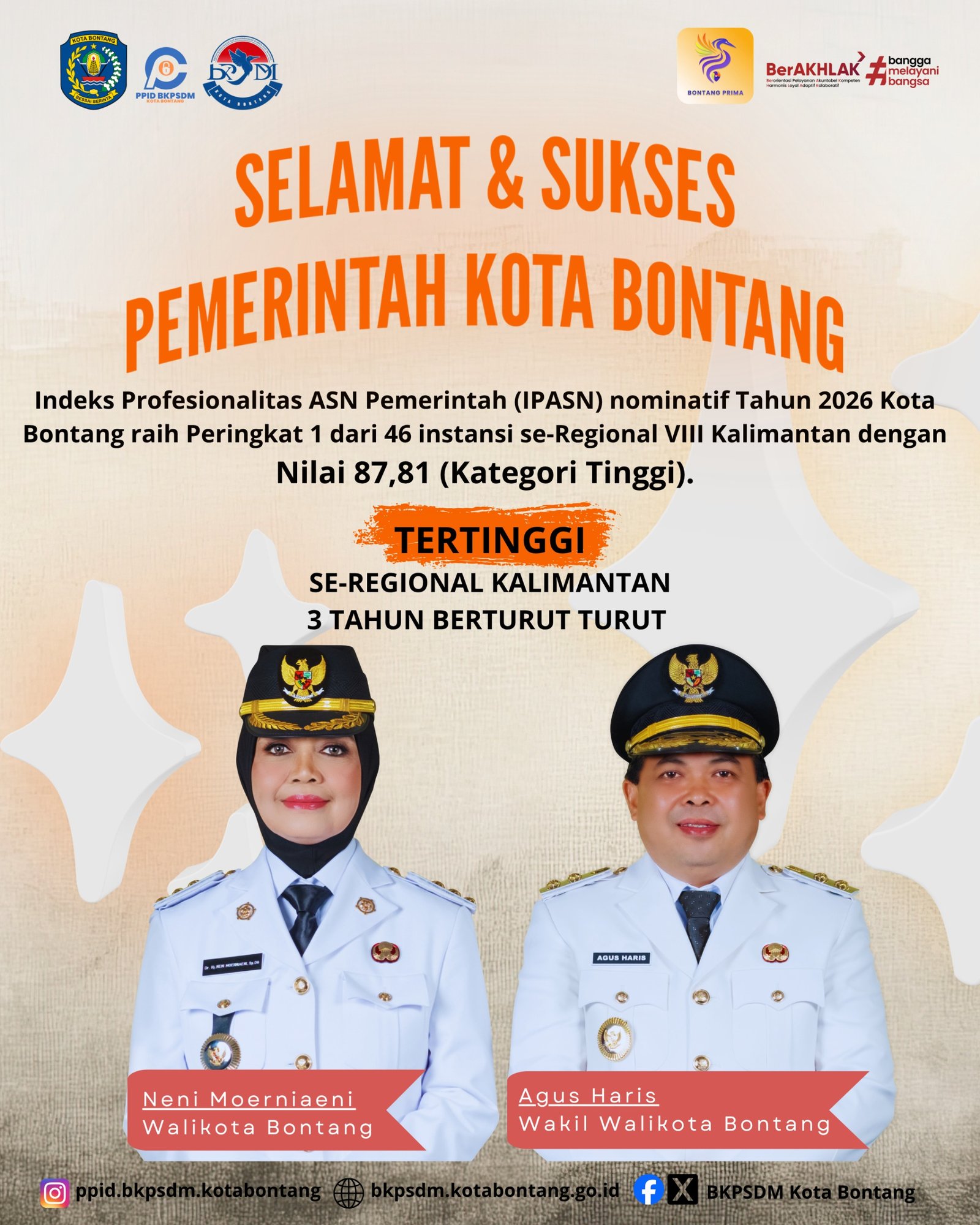 Potretkata.co, Bontang – Pemerintah Kota (Pemkot) Bontang kembali menorehkan prestasi membanggakan dalam reformasi birokrasi dengan meraih nilai Indeks Profesionalitas ASN (IPASN) sebesar 87,81, tertinggi se-Regional VIII Kalimantan Tahun 2026. Capaian ini menjadi semakin istimewa karena merupakan hattrick atau keberhasilan tiga tahun berturut-turut sejak 2024 hingga 2026, yang menunjukkan konsistensi luar biasa dalam menjaga kualitas aparatur sipil negara.